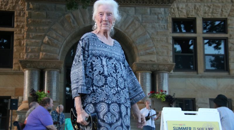 During a song, an onlooker gets up and begins to dance with her tambourine. Lead singer Robin Winslow’s cousin cheers