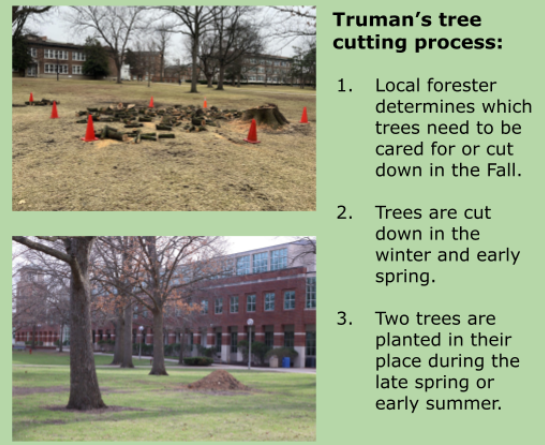 The trees are maintained and cut down as part of the requirements for Truman’s Tree Campus Higher Education Program. The title from Arbor Day Foundation requires campuses to have educational experience with trees, an annual care plan, and replanting and pruning with the department of conservation.