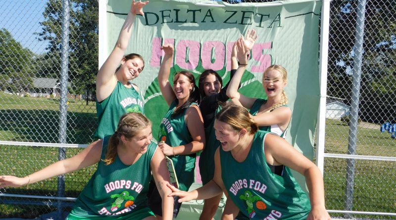Members of Delta Zeta pose in front of their banner for the event. From upper left to right: Ashley Spry, Drew Anderson, Lily Samerau and Loren Howard. From lower left to right: Kayla Schilly and Gabi Cook.