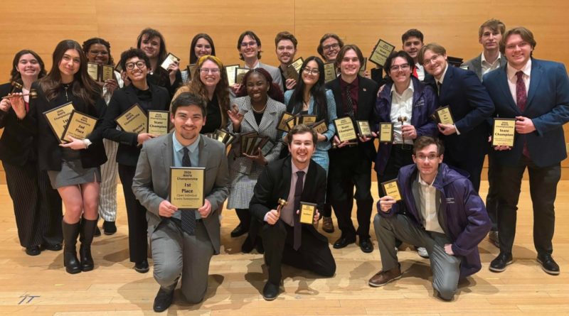 All 21 of the competitors display their awards at the end of the Missouri Association of Forensics Activities (MAFA) State Tournament awards ceremony Feb. 14. 40 places were earned among the attendees, and seven of them were state champion titles. (Photo submitted by Jessie Phillips)