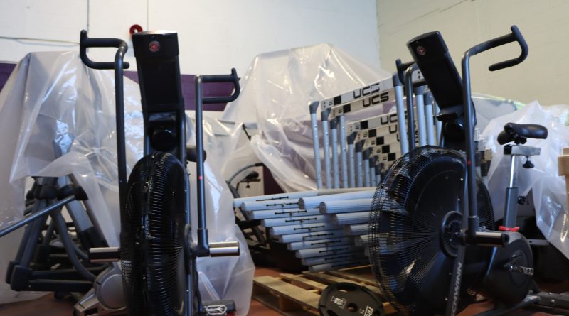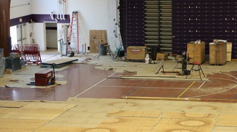 Gym equipment is kept under tarps during construction. Tarps were also placed under construction materials on the court.