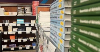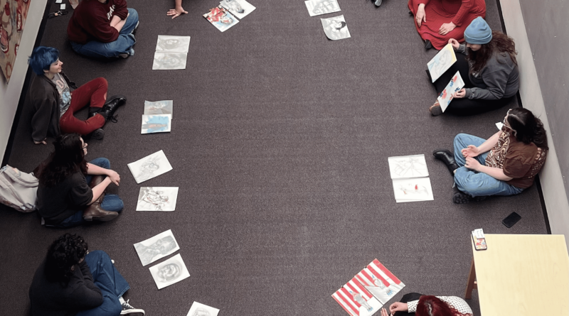 Professor Dunnagan sits with her class under the skylight in OP. The class left their windowless classroom after the lights went out.