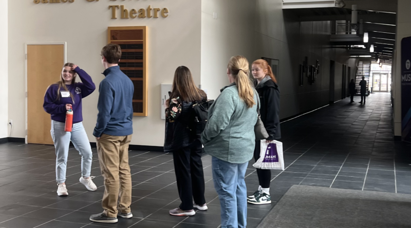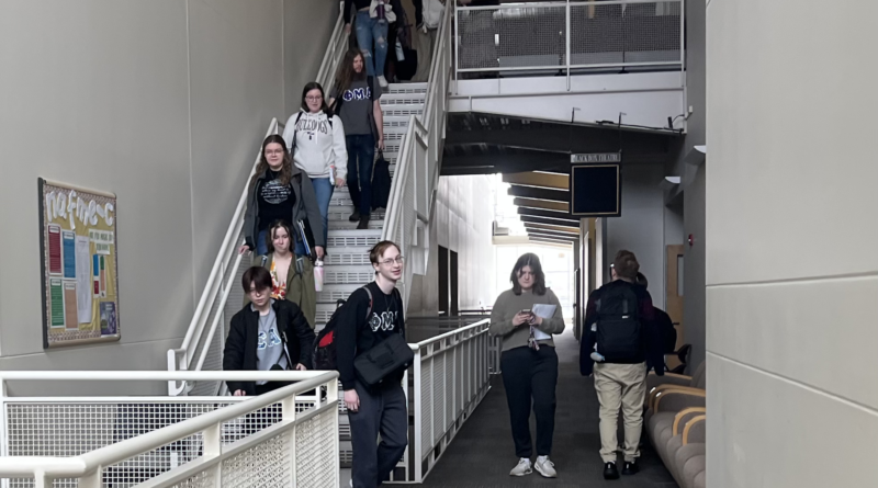 Music students leave their third-floor classroom. A number of art and music classes had to stop early because they require electricity for printing, power tools, or recording devices.