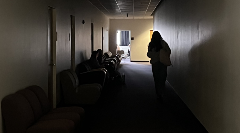 Students walk through dark hallways to get to class. The backup generator only kept emergency lights on.