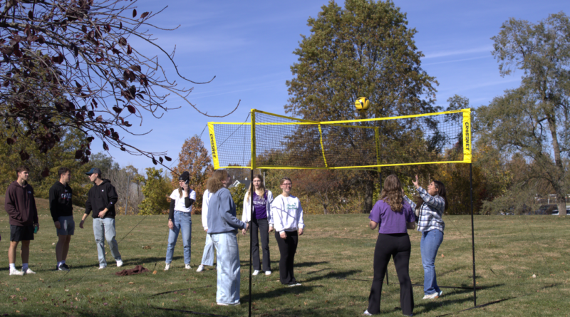 Truman students play four square volleyball to the side of the tailgate. In the parking lot, other attendees played corn hole, prize games, and Mario Kart.