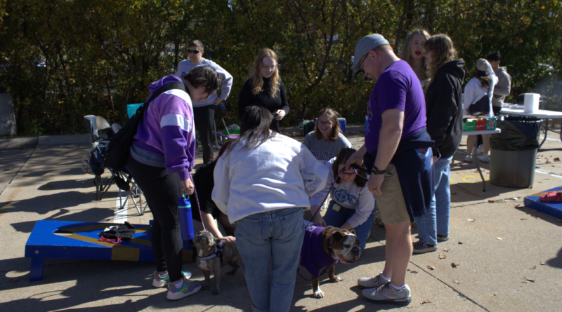 Bulldogs Orla and Quarter receive attention from Truman students. Orla is wearing a purple Truman State shirt.