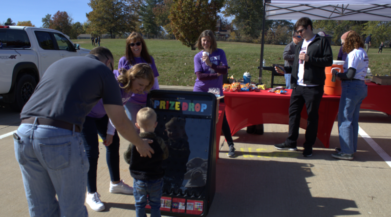 A father and son play Prize Drop outside of a tent. Prizes included pop-its, squishy toys, and other small items.