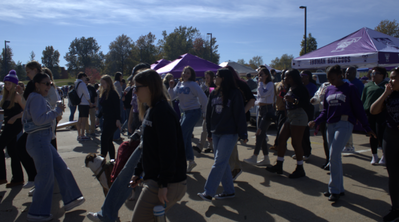 Students dance to the Cupid Shuffle in front of the Diversity and Inclusion tent. Multiple campus organizations had tents set up at the tailgate.