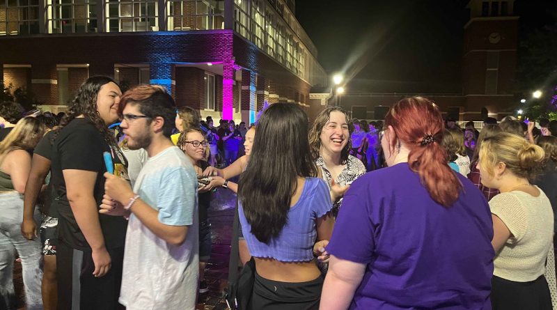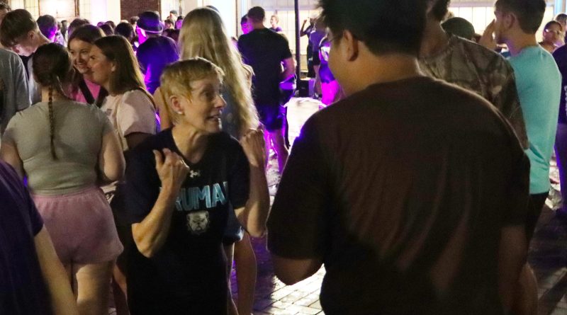 Students gather around the fountain for the ice cream social in 2024. Students received free ice cream while music blared in the background as a way to meet other new students. (photo by Grace Potter) Truman State University President Sue Thomas urges two freshmen run through the fountain like she did moments before. The Ice Cream Social was held from 9p.m. to 10p Aug. 13.m. after the Residence Hall orientations. Freshmen gather around the fountain for Truman State University’s Ice Cream Social. The students were given free ice cream along with getting to dance in the University fountain.