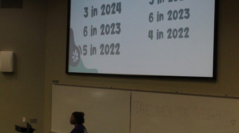 Walker presented before the walk, describing her personal experiences and her passion for the cause. Walker shared the most recent Safety and Fire Act statistics, which included three reported rapes on campus, four reported cases of domestic violence, and one reported case of fondling during the previous school year.