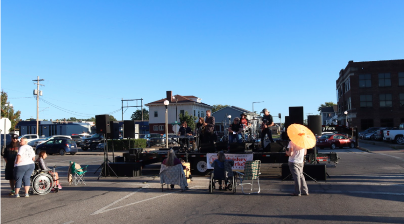 People gather around live music in front of The Press Room. Two bands play throughout the night: Deadwood, from Kirksville, and rikeR.