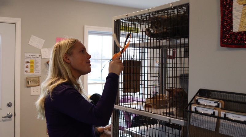 Freshman Belle Daniels pays with a cat named Luna from the shelter. Truman State University’s team regularly volunteers at the shelter to visit with cats and dogs.