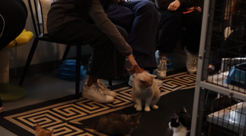 Tennis players Nayana Malangi, MaryGrace Seymour and Himari Maruyama pet and play wth cats from a local animal shelter.