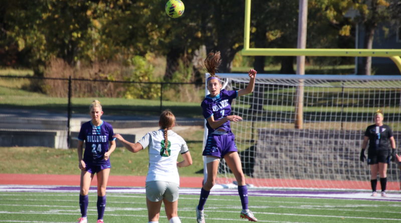 Greta Hanson headbutts the ball away from Truman’s goal. Hanson is a defender for the Truman Bulldogs.