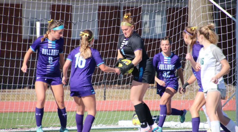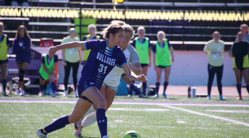Bailey Allen swings her leg back to kick the ball. Allen is a defender for the Bulldogs and played the whole time against Missouri S&T.
