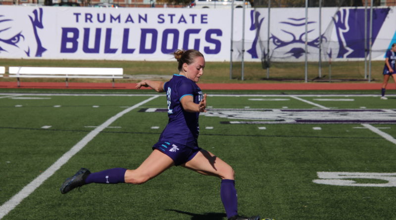 Tatum Damron kicks the ball towards the midfield. Damron is a goalkeeper for the Truman State Bulldogs and had seven saves earlier in the season against Drury.